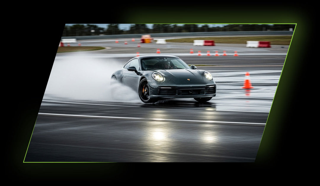 Percorso handling su fondo a bassa aderenza per simulare il drifting e ilcontrollo della vettura in controsterzo su Porsche 992 GTS.